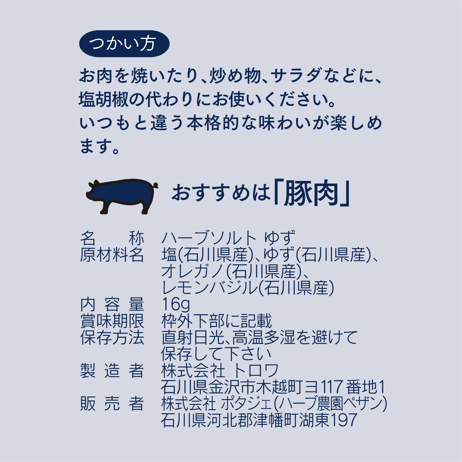〈原材料〉塩(石川県産)、ゆず(石川県産)、オレガノ(石川県産)、レモンバジル(石川県産)