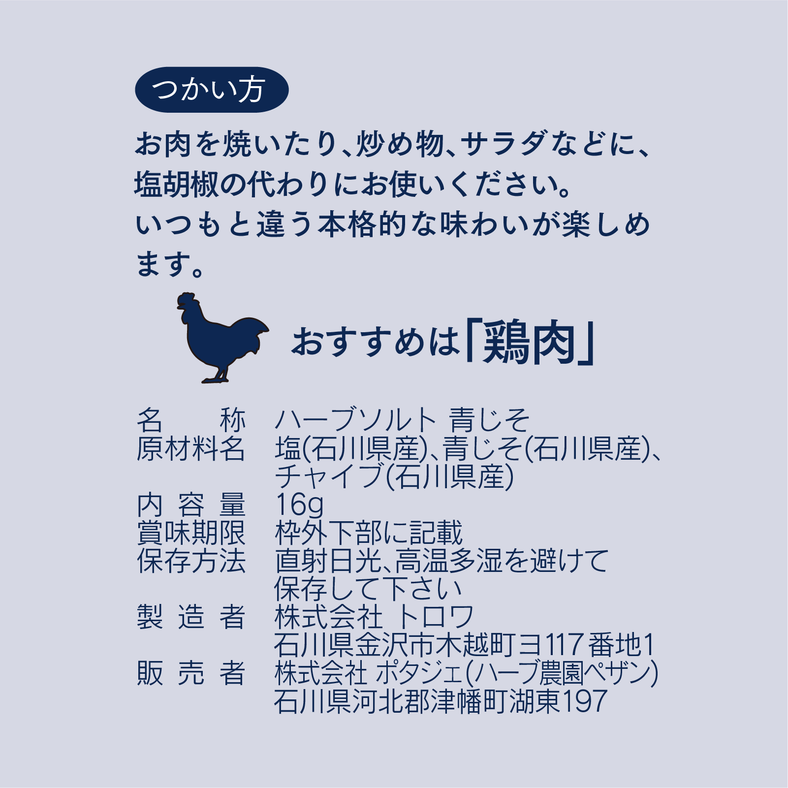〈原材料〉塩(石川県産)、青じそ(石川県産)、チャイブ(石川県産)
